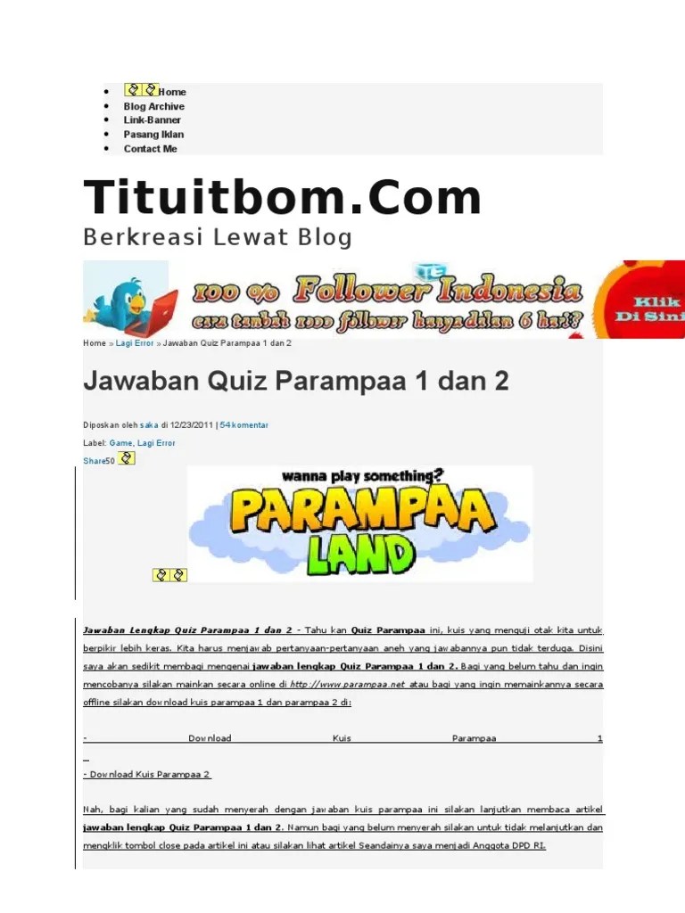 Klik huruf v pada tulisan levellevel 111 : Masih inget postingan sebelumnya tentang quiz parampaa? Klik i pada tulisan indonesia. Jawaban quiz parampaa, jawaban quiz parampaa 2, jawaban quiz parampaa 1 level 100, jawaban quiz parampaa 2 level 111 . Quiz parampaa 1,2,3 + kunci .