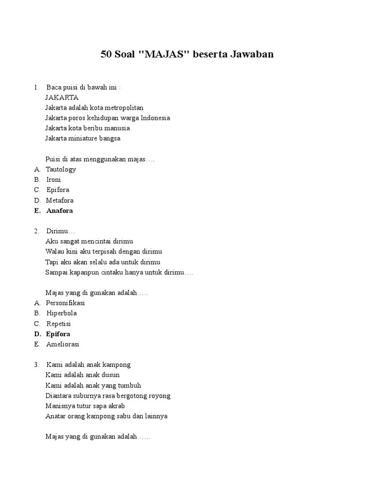 Ikuti penjabaran dan contoh soal yang menarik ini untuk lebih mengerti lagi . Puisi di atas menggunakan majas…. Alegori adalah majas yang menggunakan perbandingan dengan bahasa yang lengkap . Larik bermajas metafora yang tepat untuk melengkapi puisi tersebut adalah aku ini binatang jalang. (soal prediksi un bahasa indonesia smk tahun ajaran 2011 / 2012 Latihan soal bahasa indonesia tentang macam majas majas smp majas sltp. Misal soal dan pembahasan ihwal gaya bahasa dan. Majas hiperbola dan majas metafora e . Simak berbagai macam pembahasan majas untuk pelajaran bahasa indonesia. Yuk simak 5 soal bahasa indonesia materi majas dan peribahasa berikut. Soal soal ini bisa saja keluar saat kalian melaksanakan ujian nasional . Pembahasan soal ujian nasional bidang studi bahasa indonesia wacana majas atau gaya bahasa. 9 32 pm bahasa indonesia.